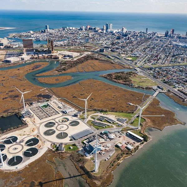 The Jersey-Atlantic Wind Farm is the first coastal wind farm in the United States and the first such wind farm in New Jersey. It became operational in March 2006, and has five 1.5 MW turbines built by General Electric. Each wind turbine reaches a height of 380 feet. The treatment plant uses approximately 50% of the wind-generated capacity from the wind turbines, providing about 60% of the wastewater plant's electricity needs. The remaining energy is provided to the main power grid for resale as premium renewable electricity.