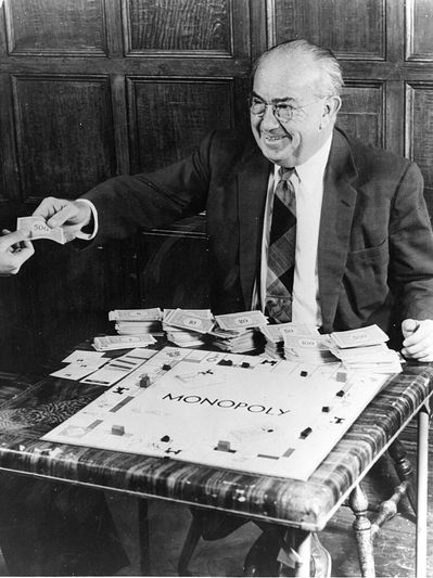 Charles Brace Darrow, right, (1889 – 1967) is often credited as the inventor of the board game Monopoly, published by Parker Brothers in 1935. However, the game’s origins trace back to The Landlord’s Game, created and patented by Elizabeth Magie in 1904 to illustrate economic inequality. Darrow encountered a modified version of Magie’s game, made changes, and sold it to Parker Brothers, who marketed him as the sole inventor. Magie’s foundational role was largely forgotten until later historical research brought it to light.
